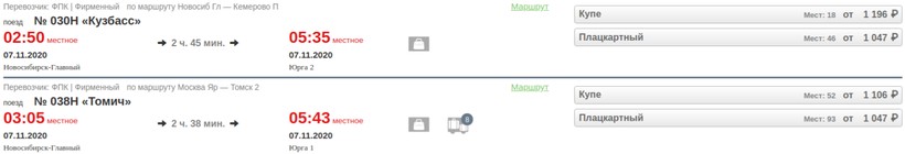 Несмотря на ночной выезд последних двух составов (придется заказывать такси до вокзала), эти рейсы подойдут пассажирам, которые планируют добраться до Юрги как можно раньше.