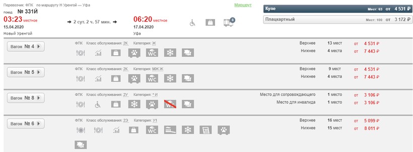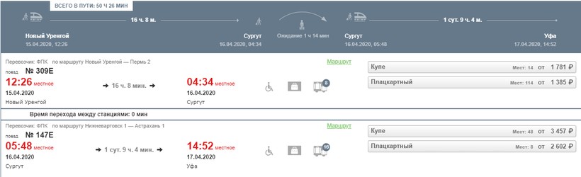 Билет до Сургута стоит 1385 и 1781 ₽ за поездку в плацкарте и купе соответственно. За проездной документ на вторую часть маршрута нужно заплатить 2602 ₽ — в плацкарте и 3457 ₽ — в купе.