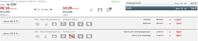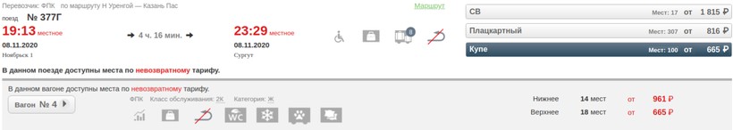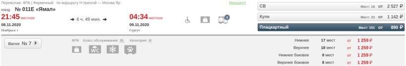 На ноябрь-декабрь минимальная стоимость билета в Сургут составляет 595 (поезд 377Г, Сидячий), а максимальная — 9136 (поезд 011Е Ямал, Люкс).