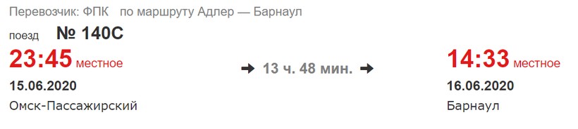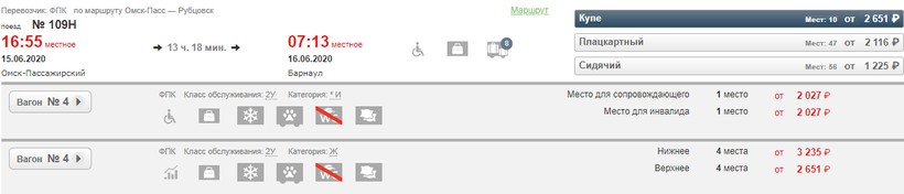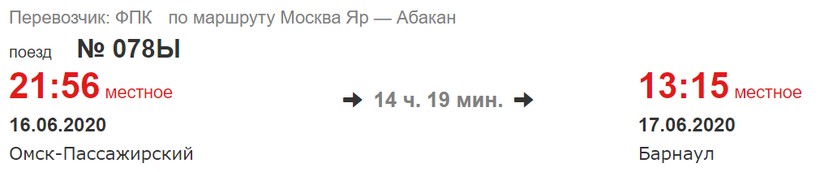 Вокзал отбытия — Омск-Пассажирский, прибытие на ж/д вокзал в Барнауле.