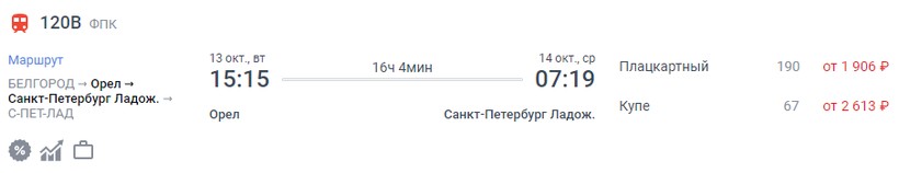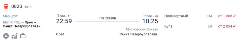 На октябрь-ноябрь минимальная стоимость билета в Санкт-Петербург составляет 1294 (поезд 120В, Плацкарт), а максимальная — 5878 (поезд 082В, Купе).