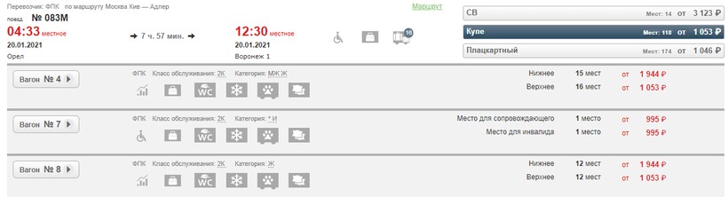На ноябрь-декабрь минимальная стоимость билета в Воронеж составляет 765 (поезд 083М, Плацкарт), а максимальная — 6666 (поезд 109В, Люкс).