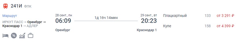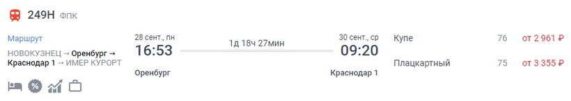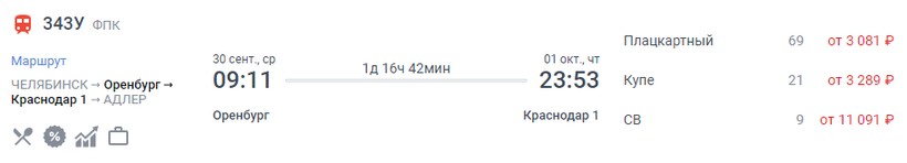 В зависимости от месяца, минимальная стоимость билета на поезд Оренбург (Россия) — Краснодар (Россия) колеблется от 1891 (ноябрь, поезд 343У) до 4 685 рублей (октябрь), а в среднем купить билет можно за 3111 — 3 210 рублей.