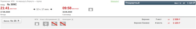 По маршруту курсируют беспересадочные вагоны (прицепляют к составу, следующему в Сыктывкар, на станции Микунь). Выезжает поезд № 309С в 21:41, прибывает через 12 часов 17 минут — в 09:58. Это самый поздний рейс. Ходит по нечетным датам. В вагонах отсутствуют кондиционеры, бывает душно. Биотуалеты не предусмотрены. Состав не новый, однако внутри чистота, порядок. Проводники вежливые по отношению к пассажирам. Спальные принадлежности в довольно хорошем состоянии. Вагон-ресторан отсутствует, не забудьте прихватить перекус еще до посадки в поезд. Есть багажное купе. Предусмотрены плацкартные, купейные вагоны.