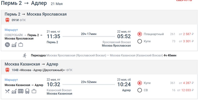 В качестве альтернативы предлагаю рассмотреть вариант с пересадкой. С Перми можно добраться сначала в Москву на поезде № 091И (отправление в 11:35, прибытие на Ярославский вокзал в 05:52). Поезд курсирует через день (даты не совпадают с выездом прямого состава). Далее предстоит пересадка продолжительностью в 4,5 часа. За этот период можно перекусить, отдохнуть, а главное — перейти на другой вокзал (Казанский). В помещении ж/д станций работают камеры хранения, где при необходимости можно оставить вещи. Выезд из Москвы на фирменном поезде № 104В «Москва — Адлер (двухэтажный)» в 10:32, приезд в Адлер в 10:24. Курсирует состав ежедневно.
