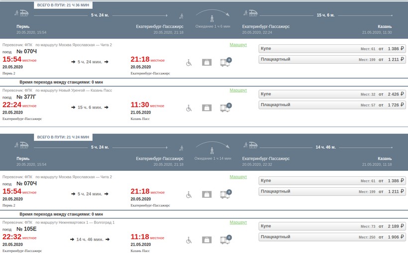 Есть несколько вариантов проезда с пересадкой в других городах. Удобнее по времени ехать через Екатеринбург. Сразу предупрежу, подобное путешествие занимает практически на 6 часов дольше, чем напрямую. Выезд с вокзала Пермь-2 на пассажирском поезде № 070Ч в 15:54, приезд на станцию Екатеринбург-Пассажирский через 5,5 часа — в 21:18. В определенные дни отправление происходит в 16:07, прибытие — в 21:35. Актуальный график смотрите перед поездкой. Переходить никуда не нужно, остается ждать чуть больше 1 часа. Выезд из того же вокзала на поезде № 377Г в 22:24, приезд через 15 часов 6 минут в Казань — в 11:30. Курсирует состав каждый день при наличии достаточного пассажиропотока.