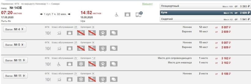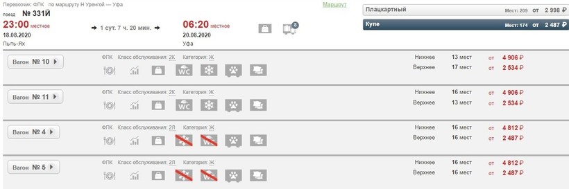 На октябрь-ноябрь минимальная стоимость билета в Уфу составляет 1565 (поезд 331Й, Плацкарт), а максимальная — 15330 (поезд 101Й, Люкс).