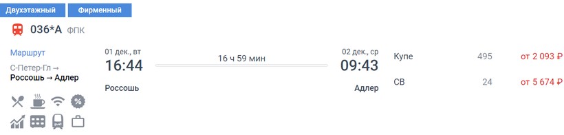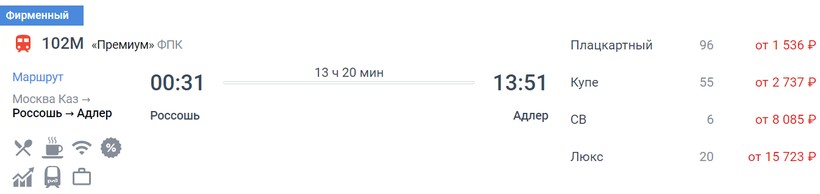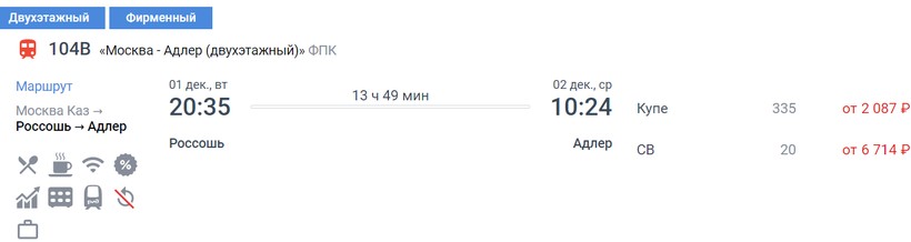 На ноябрь-декабрь минимальная стоимость билета в Адлер составляет 1307 (поезд 418*Й, Плацкарт), а максимальная — 31697 (поезд 102М Москва – Адлер, Мягкий).