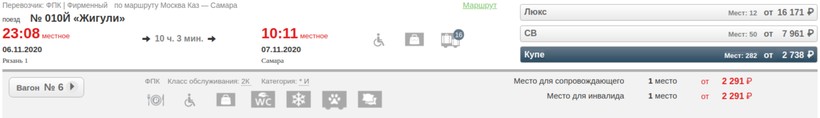 На октябрь-ноябрь минимальная стоимость билета в Самару составляет 1250 (поезд 138Й, Плацкарт), а максимальная — 52660 (поезд 010Й Жигули, Мягкий).