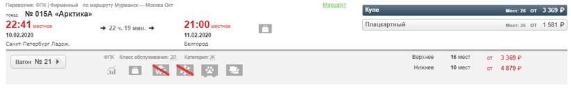 На октябрь-ноябрь минимальная стоимость билета в Белгород составляет 1534 (поезд 015А Арктика, Плацкарт), а максимальная — 17361 (поезд 081А, Люкс).