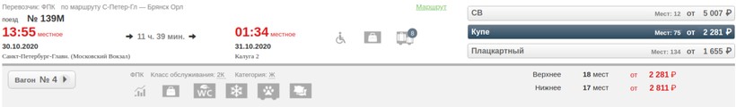 купе — 2281 рубль (нижняя полка — на 600 рублей дороже);