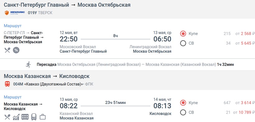 В качестве альтернативы можно рассмотреть вариант с пересадкой в Москве. Из Санкт-Петербурга в российскую столицу ежедневно ходит не один десяток составов. Уехать можно, например, на поезде № 019У (график движения — ежедневно круглый год, за исключением середины апреля) в 22:50. Прибытие в 06:50 (или в 07:07, актуальный график уточняйте) на Ленинградский вокзал Москвы. Далее предстоит пересадка — 1,5 часа. За это время нужно перейти на другой вокзал — Казанский, оттуда будет выезд в Кисловодск. Отправка из столицы в 08:22 (или 08:20) на поезде № 004М «Кавказ (двухэтажный)», прибытие к началу рабочего дня — в 08:13. Состав курсирует ежедневно.