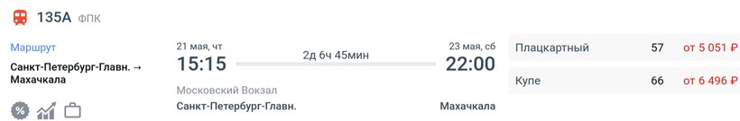 На октябрь-ноябрь минимальная стоимость билета в Махачкалу составляет 2747 (поезд 135А, Плацкарт), а максимальная — 12532 (поезд 135А, Купе).