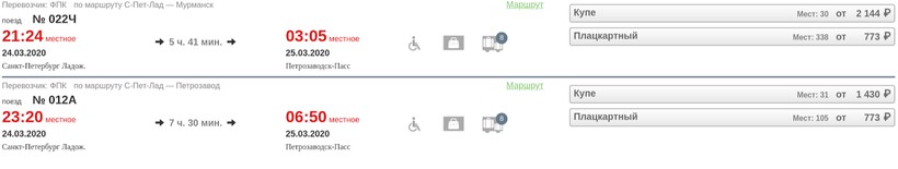 № 012А выезд в 23:20, прибытие в 06:50. Курсирует две недели в марте. Этот поезд один из самых дешевых, плюс подойдет тем пассажирам, которые освобождаются поздно и хотят попасть в Петрозаводск к началу рабочего дня.
