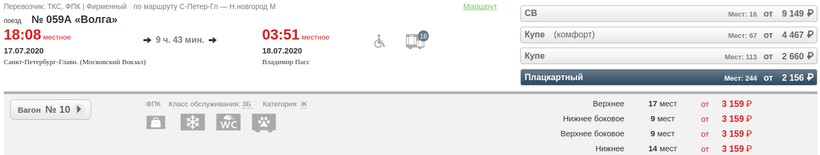 На октябрь-ноябрь минимальная стоимость билета в Владимир составляет 997 (поезд 145А, Сидячий), а максимальная — 12047 (поезд 059А Волга, Люкс).