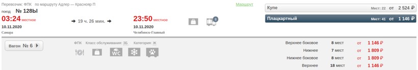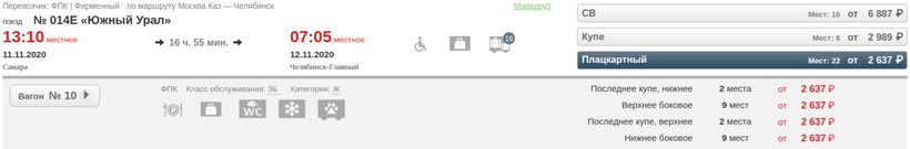 На ноябрь-декабрь минимальная стоимость билета в Челябинск составляет 1250 (поезд 134*С, Плацкарт), а максимальная — 10857 (поезд 014Е Южный Урал, Люкс).