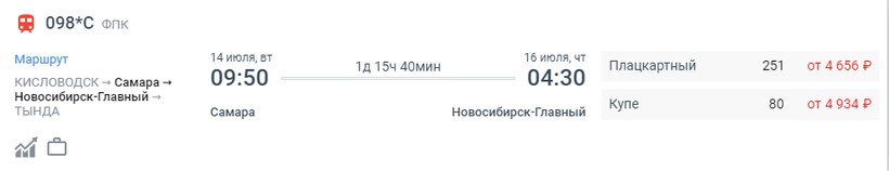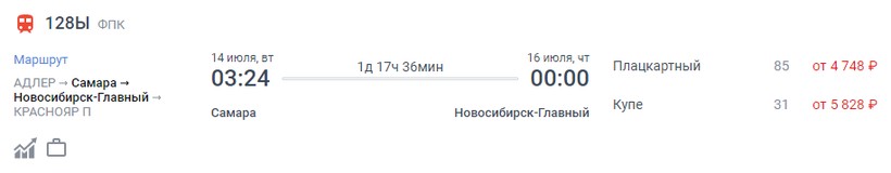 На октябрь-ноябрь минимальная стоимость билета в Новосибирск составляет 2295 (поезд 128Ы, Плацкарт), а максимальная — 7176 (поезд 130*С, Купе).