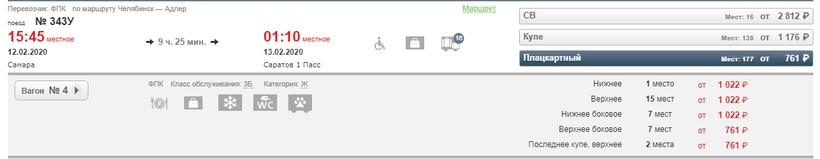 На октябрь-ноябрь минимальная стоимость билета в Саратов составляет 728 (поезд 343У, Плацкарт), а максимальная — 5768 (поезд 345Е, Люкс).