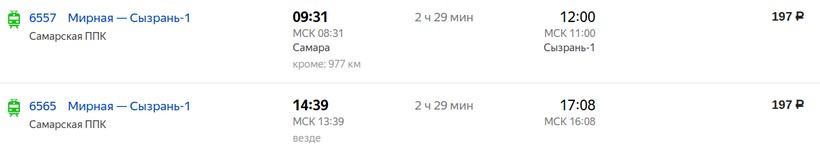 № 6557. Отправление в 09:31, прибытие через 2 часа 29 минут — в 12:00. Выбирайте этот вариант, если планируете добраться в Сызрань как можно раньше.