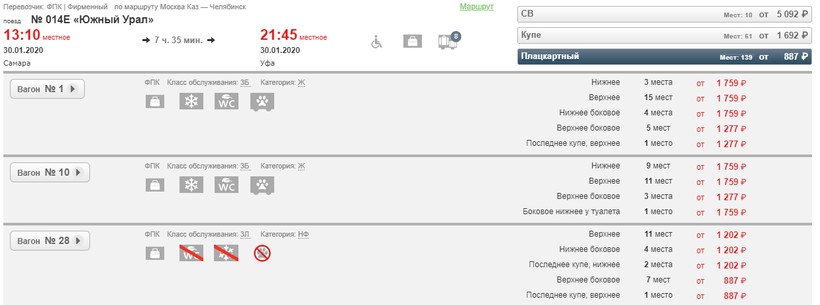 На ноябрь-декабрь минимальная стоимость билета в Уфу составляет 779 (поезд 240Э, Сидячий), а максимальная — 10965 (поезд 014Е Южный Урал, Люкс).