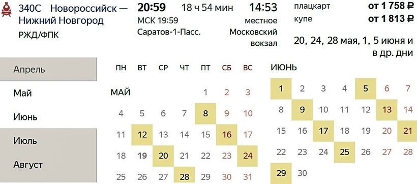 В зависимости от месяца, минимальная стоимость билета на поезд Саратов (Россия) — Нижний Новгород (Россия) колеблется от 1034 (ноябрь, поезд 339*С) до 2 187 рублей (май), а в среднем купить билет можно за 1257 — 1 265 рублей.