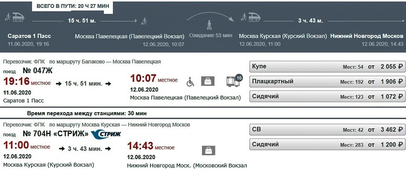 Транзитная поездка продолжительнее по времени, чем прямая, всего на 1,5 часа (занимает 20,5 ч.). Если весь путь преодолевать в сидячих вагонах, проездные обойдутся от 2272 ₽. Но я советую ехать до российской столицы в плацкартном или купейном вагоне, а из Москвы до Нижнего Новгорода — в сидячем. Такие билеты будут стоить от 3106 ₽ и 3221 ₽ соответственно. К недостаткам данного способа преодоления маршрута могу отнести то, что в Москве придется добираться с Павелецкого вокзала на Курский (поездка на метро по коричневой ветке займет всего около 25 минут).