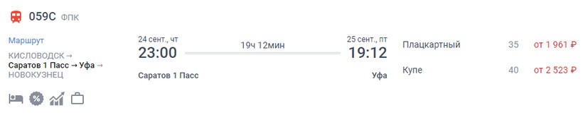 На октябрь-ноябрь минимальная стоимость билета в Уфу составляет 1172 (поезд 127*Ы, Плацкарт), а максимальная — 9225 (поезд 059С, Люкс).