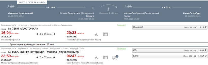 В электропоезде предусмотрены только вагоны с сидячими местами. Однако в середине очень удобно — мягкие кресла, без нареканий работают санузлы (био), система кондиционирования. Далее предстоит пересадка около 2,5 часа. За это время обязательно нужно перейти на другой железнодорожный вокзал. Прибытие из Смоленска происходит на Белорусский, а выезд в Санкт-Петербург с Ленинградского вокзала. Это займет от 30 минут. Отправка в Питер на фирменном поезде № 006А «Санкт-Петербург — Москва (двухэтажный)» в 22:50, прибытие в 06:57 (время проведенное в пути составляет 7 часов 57 минут). До конца апреля приезд происходит на 10 минут позже. Состав курсирует ежедневно до конца июня, дальше только шесть раз в неделю (кроме субботы). В поезде есть две категории вагонов: купейные, СВ. Они оснащены биотуалетами, кондиционерами. Работает вагон-ресторан (услуга питания предоставляется всем пассажирам). В СВ есть телевизор. Путешествие с пересадкой в Москве занимает 14 часов 43 минуты.