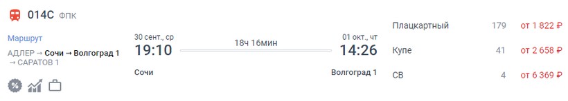 Актуальные цены и расписание поезда Сочи — Волгоград, стоимость и информация о наличии билетов на пассажирские и скорые поезда АО «ФПК».