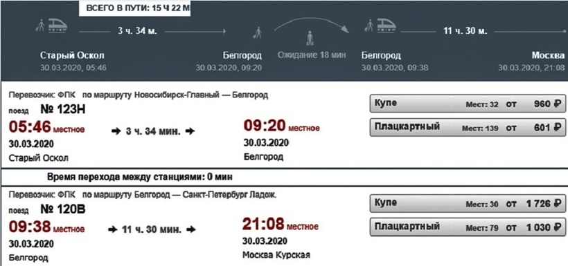 отправление из Белгорода в 09:38 на поезде № 120В, прибытие в российскую столицу в 21:08.