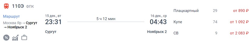Отправление — 23:31, прибытие на станцию Ноябрьск-2 в 04:43 (придется подумать о трансфере). Время в пути — 5 ч. 12 мин. Ходит ежедневно.