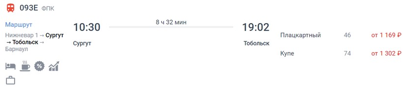 Актуальные цены и расписание поезда Сургут — Тобольск, стоимость и информация о наличии билетов на скорые, пассажирские и скорые фирменные поезда АО «ФПК».