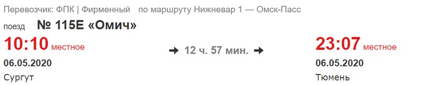 № 115Е «Омич» — ходит строго через день, выезд — 10:10/10:12/10:22, прибытие — 23:07/01:34; не самый удобный вариант, до нужного места придется добираться ночью. Минимум в дороге — 12 ч. 55 мин.