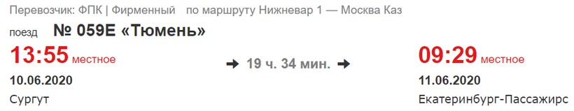 № 059Е «Тюмень». График движения вполне удобный, отбытие — 13:55, на конечной остановке — 09:29–10:09. Минимальное время в дороге — 19 ч. 34 мин. Курсирует через день, его сменяет состав № 341У.