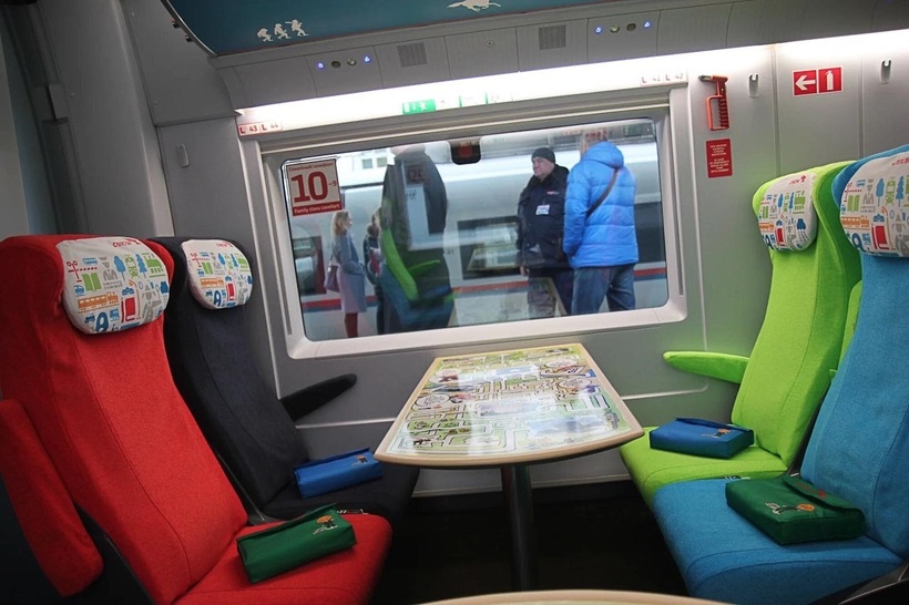 Внутри чисто, поездная бригада общительная, предоставляет высокий уровень сервиса, по возможности помогает пассажирам. Большие чемоданы лучше сдавать в багажное купе, оплатить услугу можно сразу при покупке билета (талон предъявляют при посадке). В каждом вагоне установлен биотуалет, которым можно пользоваться во время остановок, есть кондиционеры. Питание не включено в стоимость проездного, еду можно брать самостоятельно (достаточно часто проводники позволяют оставлять продукты у себя в холодильнике). Как вариант — покупайте перекус на вокзалах, маршрут включает несколько остановок продолжительностью в 30 минут. Также работает вагон-ресторан, цены кусаются, однако порции большие, голодными не останетесь (еду доставляют прямиком к месту). В поезде предусмотрены вагоны с услугой перевозки домашних животных, специальные купе для пассажиров с инвалидностью.