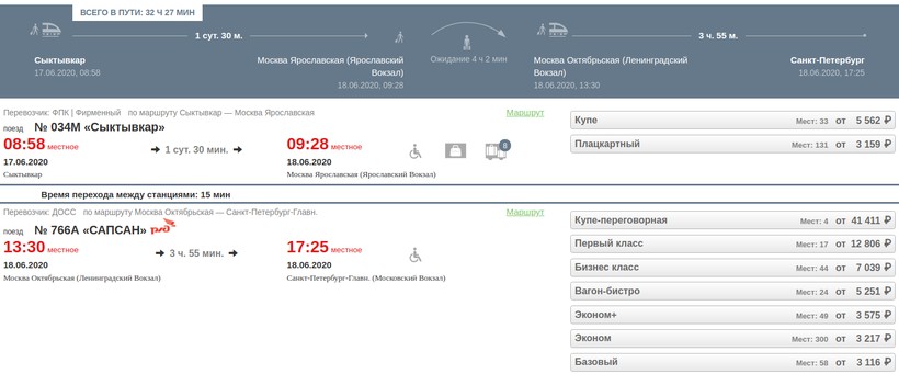 В качестве альтернативы предлагаю вариант с пересадкой в Москве. По времени получится почти так же, как на прямом поезде (1 день 8,5 часа). Минус — не так комфортно, ведь придется ждать следующий рейс, переносить вещи. Выезд из Сыктывкара (в 08:58) на фирменном поезде № 034М «Сыктывкар» (курсирует дважды в неделю — по средам, субботам). Прибытие происходит в 09:12 (с мая до середины июля приезд в 09:28). В составе есть плацкартные, купейные вагоны, каждый из них оборудован биотуалетами, кондиционерами, электронной информационной панелью, розетками. Работает вагон-ресторан, предоставляется услуга питания. В стоимость билетов в купе входит дорожный набор, комплект постельного белья, пресса. Пересадка в Москве занимает около 4 часов. За этот период времени нужно перейти на другой вокзал — поезд из Сыктывкара приходит на Ярославский, а выезжать в Санкт-Петербург нужно с Ленинградского. Отправление из столицы (в 13:30) на скоростном поезде № 766А «САПСАН», прибытие через 3 часа 55 минут (в 17:25). В составе есть вагоны только с местами для сидения разного класса обслуживания.