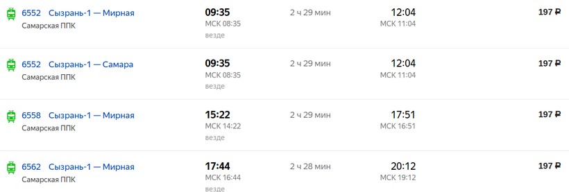 № 6572. Отправление в 04:40, прибытие через 2,5 часа — в 07:10. Если нужно как можно раньше приехать в Самару, выбирайте этот вариант.