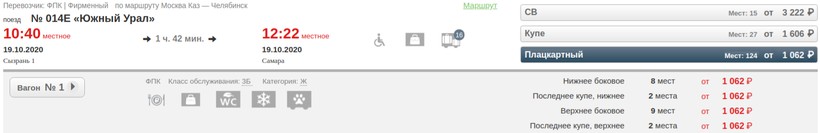 На октябрь-ноябрь минимальная стоимость билета в Самару составляет 383 (поезд 338*Ж, Сидячий), а максимальная — 24619 (поезд 010Й Жигули, Мягкий).