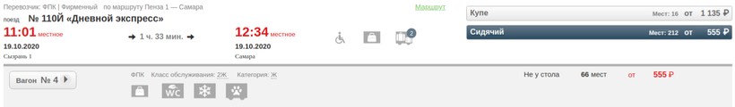 № 6570. Выезд в 05:53, приезд — в 08:21. Время в пути — 2 часа 28 минут. Хороший расклад для тех, кто планирует добраться в пункт назначения к началу нового рабочего дня.