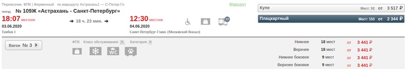 На фирменном поезде № 109Ж можно добраться за 18 часов с небольшим. Курсирует состав ежедневно круглый год, за исключением середины мая (выезды осуществляются через день). Отправляется в 18:07. А вот время прибытия может быть разное — до 27.04 состав приезжает в 12:03, далее — в 12:40/12:25, а уже с 25.05 — в 12:30. Актуальный график лучше всего просматривать перед поездкой. Еще один момент — на посадку приходите заранее, ведь этот поезд следует из Астрахани, в Тамбове стоит около 18 минут.