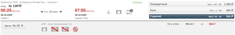 На октябрь-ноябрь минимальная стоимость билета в Саратов составляет 581 (поезд 048*Й, Сидячий), а максимальная — 15191 (поезд 010*Г Саратов, Мягкий).