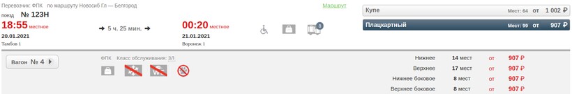 На ноябрь-декабрь минимальная стоимость билета в Воронеж составляет 673 (поезд 123Н, Плацкарт), а максимальная — 3149 (поезд 123Н, Купе).