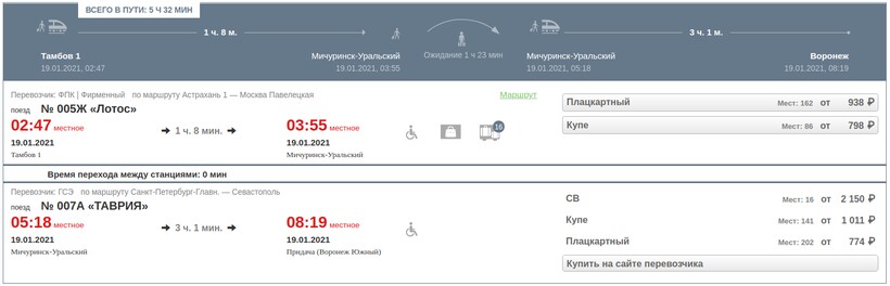 Вариант с транзитом выбирайте в случае крайней необходимости. Это не очень комфортно по нескольким причинам: в большинстве случаев пересадка занимает от 1 часа (нужно переезжать с одного вокзала на другой), часто пересаживаться нужно ночью (выспаться не получиться), по деньгам обойдется в 1,5 и более раза дороже. Добраться до Воронежа можно через Мичуринск. Путешествие занимает 5,5 часа. Отправление из Тамбова (в 02:47) на фирменном поезде № 005Ж «Лотос», прибытие через 1 час 8 минут — в 03:55. Состав курсирует ежедневно, но в феврале, марте, апреле — только по четным датам. Пересадка занимает практически 1,5 часа. Никуда не нужно переходить. Выезд из Мичуринска (в 05:18) на поезде № 007А «ТАВРИЯ», прибытие через 3 часа 1 минуту — в 08:19/08:20. Состав курсирует до середины декабря по четным датам, далее — ежедневно.