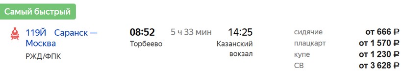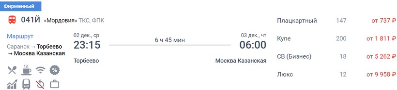 Актуальные цены и расписание поезда Торбеево — Москва, стоимость и информация о наличии билетов на пассажирские, скорые и скорые фирменные поезда АО «ФПК».