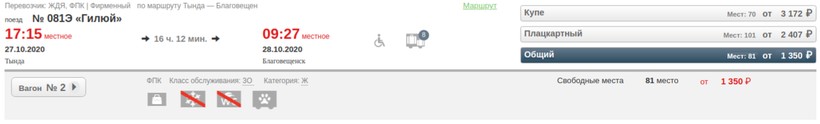 На октябрь-ноябрь минимальная стоимость билета в Благовещенск составляет 1465 (поезд 081Э Гилюй, Общий), а максимальная — 5736 (поезд 081Э Гилюй, Купе).