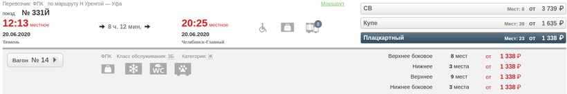Пример стоимости билетов на состав № 331Й за месяц до отправления: