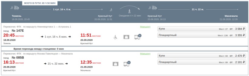 Добраться до Махачкалы можно, сделав пересадку на станции Красный Кут. Поездка не такая комфортная, как на прямом поезде. Выбирать этот вариант стоит в крайнем случае. Отправление из Тюмени (в 20:45) на поезде № 147Е (курсирует по четным датам), прибытие через 1 день 16 часов 6 минут — в 11:51. Состав старого образца, только несколько вагонов с новыми биотуалетами, кондиционерами, достаточным количеством розеток. Есть купе, плацкарты. Персонал вежливый.