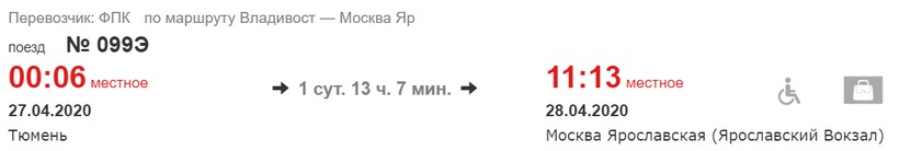 № 099Э — вариант для тех, кто освобождается поздно, отправление — 00:06, прибытие — 11:13. Продолжительность путешествия — 1 д. 13 ч. 7 мин. Курсирует ежедневно;