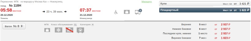 В зависимости от месяца, минимальная стоимость билета на поезд Тюмень (Россия) — Новокузнецк (Россия) колеблется от 2107 (февраль, поезд 138*Е) до 12 253 рубля (сентябрь), а в среднем купить билет можно за 2910 — 3 017 рублей.