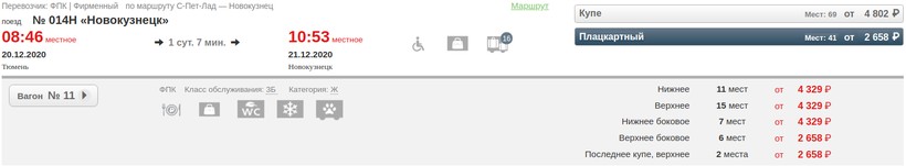 На октябрь-ноябрь минимальная стоимость билета в Новокузнецк составляет 3017 (поезд 138*Е, Плацкарт), а максимальная — 14038 (поезд 118Н, Люкс).